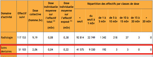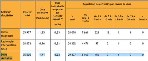 La Radioprotection des travailleurs (2017)Bilan IRSN 2017 : Exposition professionnelle aux rayonnements ionisants en France (Note : Cliquez sur l'image pour zoomer) La dose individuelle moyenne sur l'effectif exposé (pour les soins dentaires) a été de 0,23 mSv pour l'année 2017.