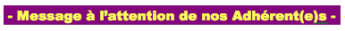 --- IMPORTANT --- Chers Confrères, Chères Consoeurs, En votre qualité d'adhérent(e) à l'Association PRECAUTION, nous vous informons que vous avez dû recevoir ce jour dans votre boite mail, notre Bulletin d'Information n°1 de Janvier 2022. Cet envoi nécessite votre attention toute particulière et nous vous invitons à en prendre connaissance sans tarder en raison de la nouvelle règlementation applicable depuis cette année (Structure OCR notamment). Si vous n'avez pas reçu notre envoi électronique (regardez à tout hasard le dossier indésirables Spam dans votre logiciel de messagerie), contactez-nous afin que nous vérifions ensemble votre adresse email et nous vous ferons parvenir à nouveau , directement, ce Bulletin d'Information n°1. Merci de votre confiance, Dr Hervé PARFAIT Tél : 01 64 30 15 83 herve-parfait@associationprecaution.fr 26/01/2022